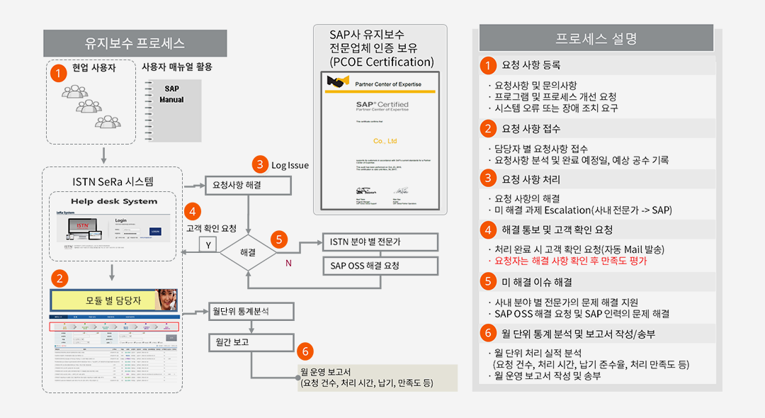 ISTN은 SAP사의 Expert한 유지보수 Partner로 인증 받고 있으며, 고객이 등록한 요청 사항의 접수부터 완료까지 자체 Service Management 시스템을 활용하여 체계적인 절차에 따라 서비스를 수행합니다.