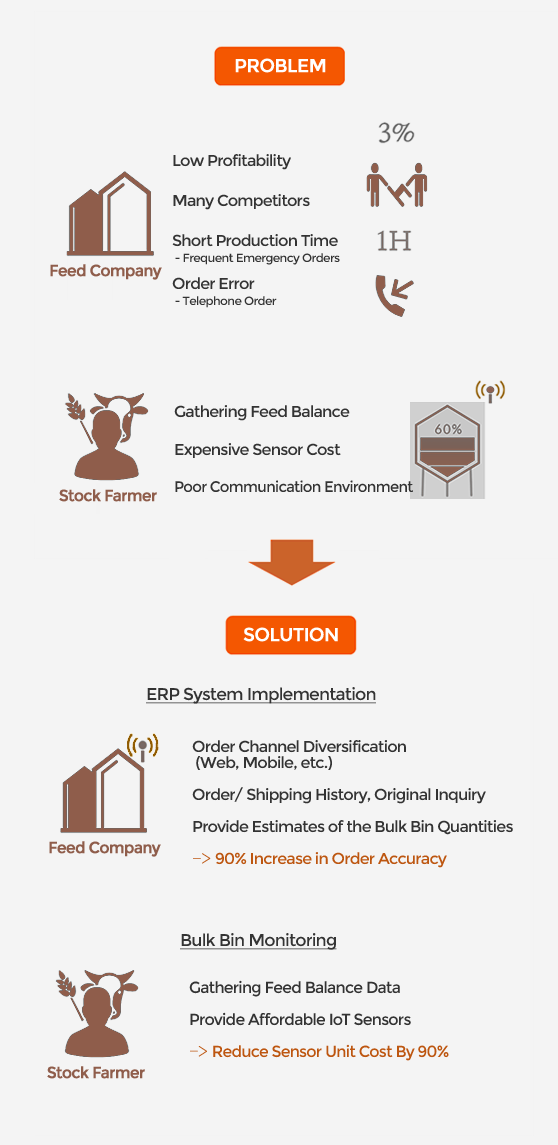 Apply IoT technology-based sensors, mobile communication technologies, cloud SAP CLOUD PLATFORM (SCP) and dashboard SAP LUMIRA technology to the bulk supply unit of livestock farms. Based on this, the livestock farming and feed companies are provided with the remaining feed amount and automatic delivery to the reorder point.
